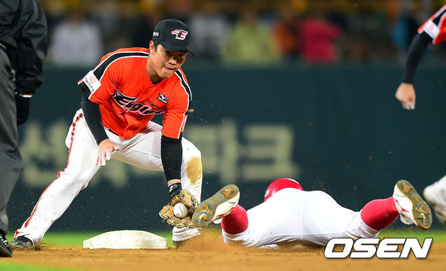 7회말 2사 1루 한화 정근우가 2루 도루를 시도하는 KIA 박기남을 잡아내고 있다.
