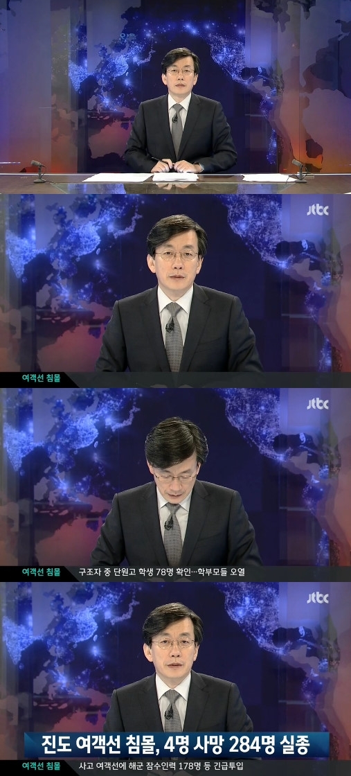 손석희 앵커는 16일 오후 방송된 'JTBC 뉴스9' 오프닝에서 “저는 지난 30년 동안 갖가지 재난보도를 진행해온 바 있습니다. 제가 배운 것은 재난보도일수록 사실에 기반해서 신중해야 한다는 것과 무엇보다 희생자와 피해자의 입장에서 사안을 바라봐야 한다는 것이었습니다”고 말문을 열었다.