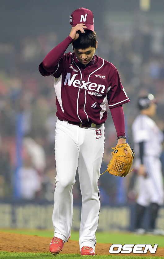 16일 오후 서울 잠실구장에서 열린 '2014 한국야쿠르트 세븐 프로야구' LG 트윈스와 넥센 히어로즈의 경기 8회말 2사 1,3루 대타 오지환을 삼진으로 처리한 한현희가 덕아웃으로 향하고 있다.