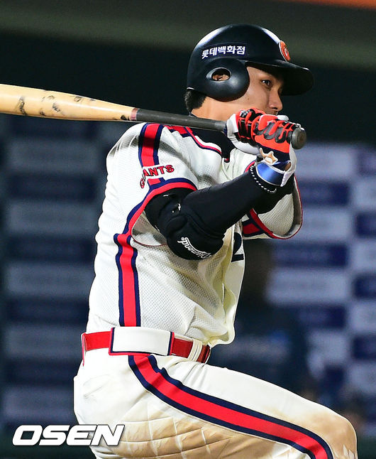 6회말 2사 3루 롯데 김문호가 1타점 동점 적시타를 날리고 있다.