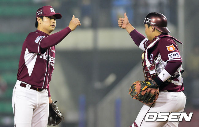 16일 오후 서울 잠실구장에서 열린 '2014 한국야쿠르트 세븐 프로야구' LG 트윈스와 넥센 히어로즈의 경기 종료 후 손승락과 허도환이 하이파이브를 하고 있다.