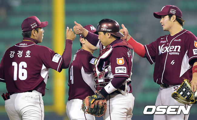 16일 오후 서울 잠실구장에서 열린 '2014 한국야쿠르트 세븐 프로야구' LG 트윈스와 넥센 히어로즈의 경기 종료 후 넥센 선수들이 하이파이브를 하고 있다.