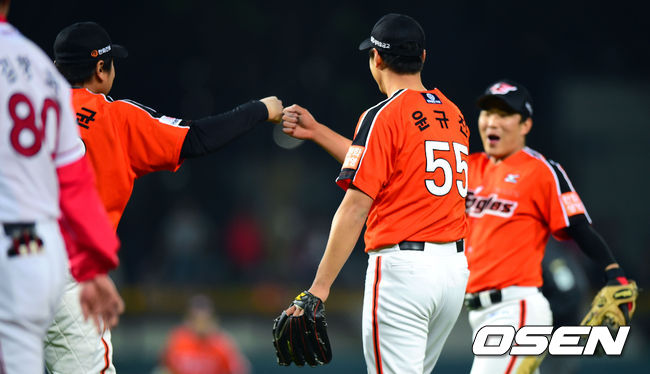 승리를 거둔 한화 윤규진이 김태균과 기뻐하고 있다./youngrae@osen.co.kr