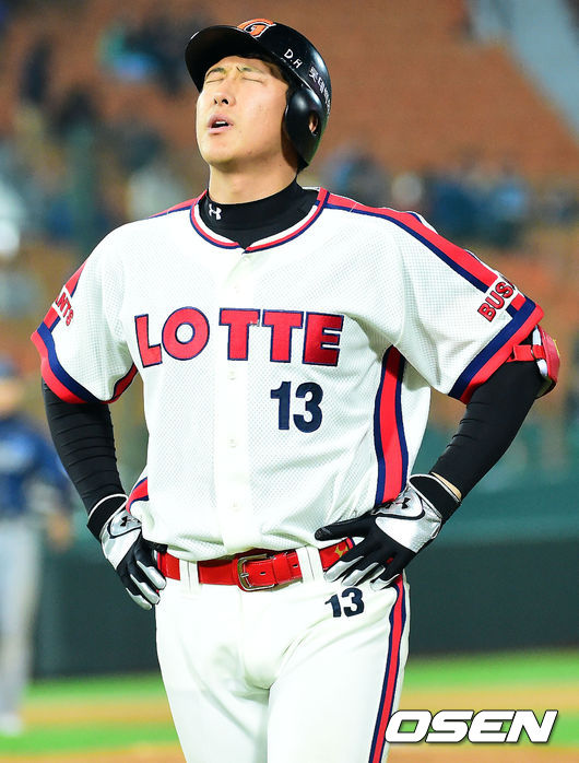 연장 10회말 무사 1루 중견수 플라이 아웃된 롯데 황재균이 아쉬운 표정을 짓고 있다.