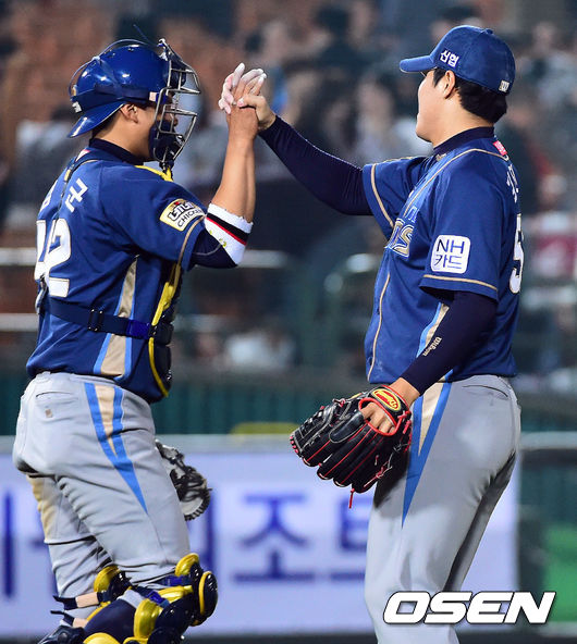 경기종료, 5연승에 성공한 NC 김태군과 김진성이 인사를 나누고 있다. /ouxou@osen.co.kr