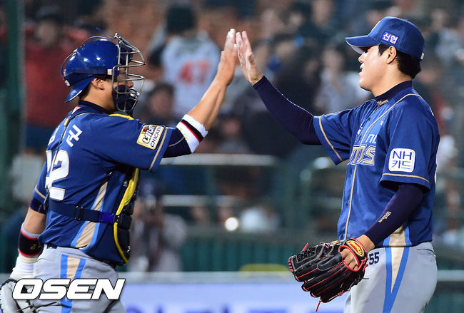경기종료, 5연승에 성공한 NC 김태군과 김진성이 하이파이브를 하고 있다. /ouxou@osen.co.kr