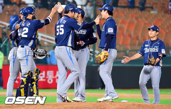 경기종료, 5연승에 성공한 NC 선수들이 기쁨의 하이파이브를 나누고 있다. /ouxou@osen.co.kr