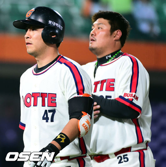 경기종료, 롯데 강민호와 최준석이 아쉬운 표정으로 그라운드를 빠져나가고 있다. /ouxou@osen.co.kr
