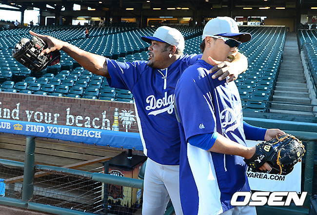 경기에 앞서 다저스 류현진과 유리베가 장난을 치고 있다.
