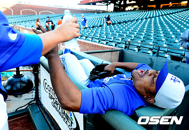 경기에 앞서 다저스 류현진과 유리베가 장난을 치고 있다.
