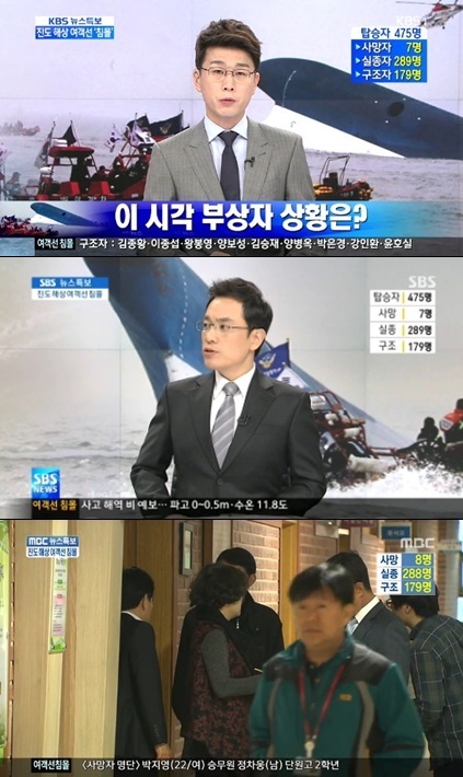 17일 오전 MBC, KBS 1TV, SBS는 모두 진도 여객선 침몰과 관련한 뉴스 특보를 긴급 편성해 방송 중이다. 그러나 실종자, 사망자 등을 집계하는 구조 현황이 30분 이상 늦게 보도되고 있다.