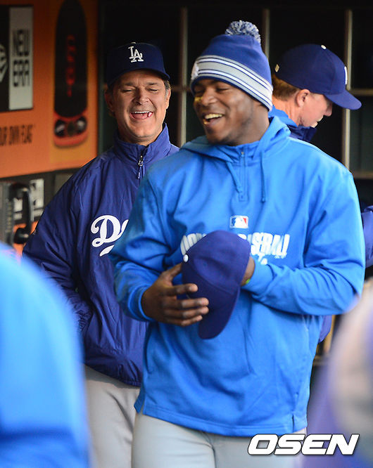 경기에 앞서 다저스 매팅리 감독과 푸이그가 이야기를 나누며 즐거워하고 있다.