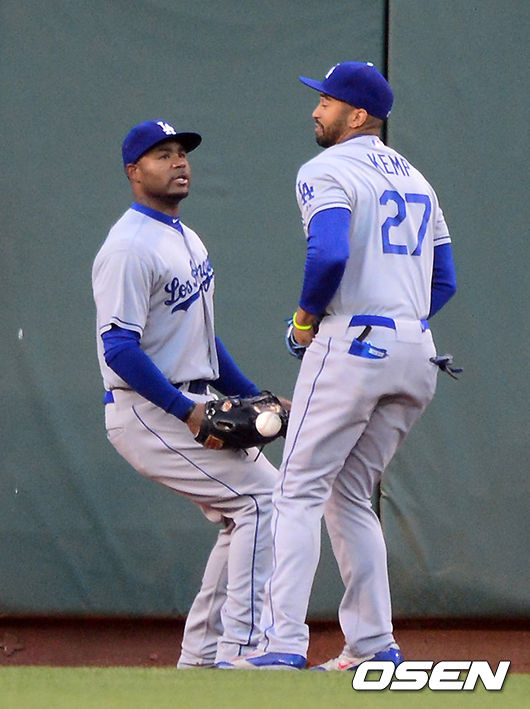 1회말 1사에서 다저스 맷 켐프가 샌프란시스코 펜스의 타구를 놓치고 있다. 펜스는 2루타.