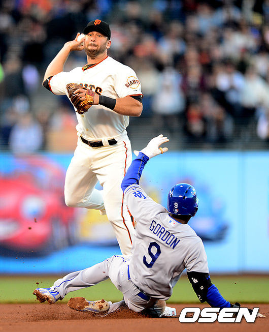 1회초 1사 1루에서 샌프란시스코 힉스가 다저스 라미레즈의 유격수 땅볼에 고든을 포스아웃시키고 1루로 송구하고 있다.