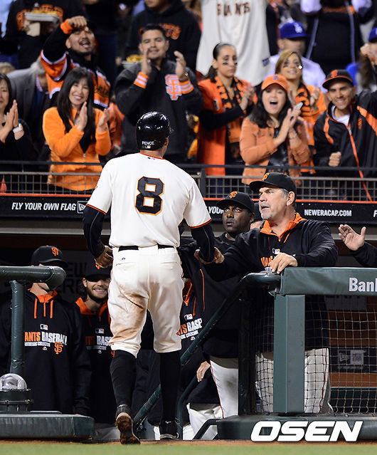 3회말 1사 1,2루에서 샌프란시스코 펜스가 포지의 선제 적시타에 홈을 밟고 보치 감독과 하이파이브를 하고 있다.