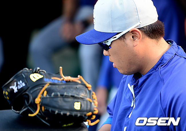 사진은 경기전 다저스 류현진이 몸을 풀기 위해 더그아웃에 들어서는 모습.