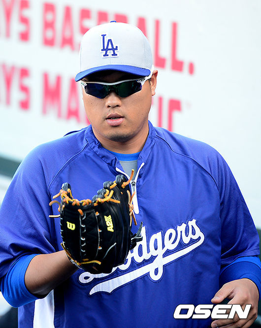 사진은 경기전 다저스 류현진이 몸을 풀기 위해 더그아웃에 들어서는 모습.