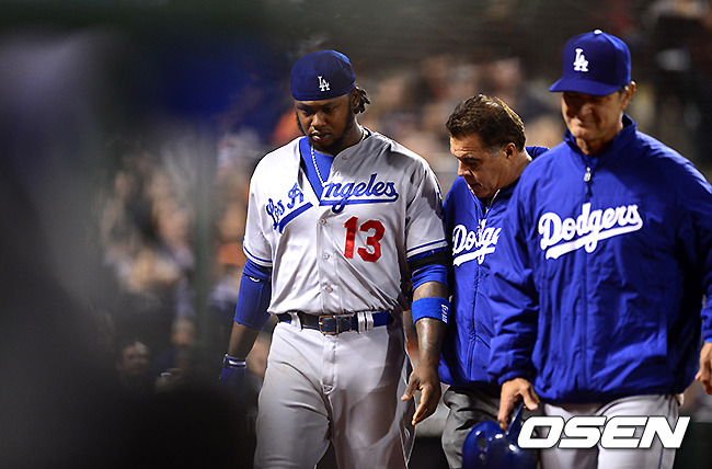 7회초 무사에서 다저스 라미레즈가 샌프란시스코 보겔송의 투구에 맞고 교체되고 있다.