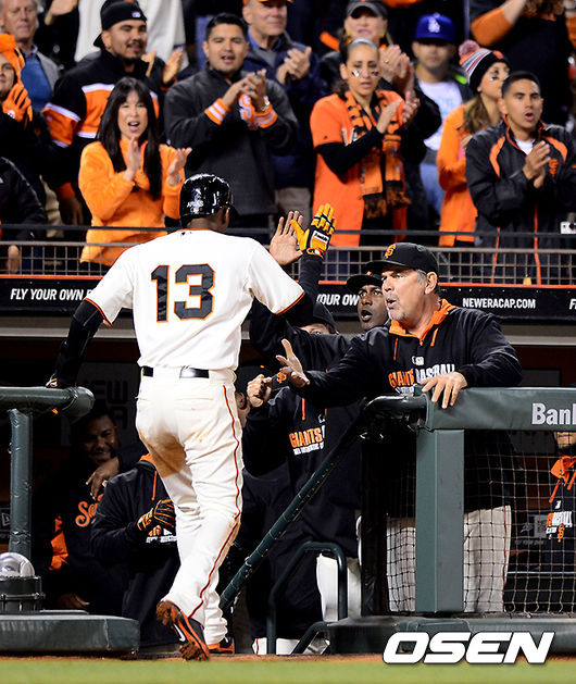 7회말 2사 1,2루에서 샌프란시스코 산도발의 1타점 적시타에 아리아스가 홈을 밟고 보치 감독과 기뻐하고 있다.