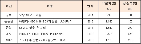 차종 별 낙찰현황은 경차 62,2%, 준중형 54,6%, 중형 54,3% 순으로 가장 높았으며 출품자의 희망가 대비 낙찰가가 상승한 주요 차량은 다음과 같다.