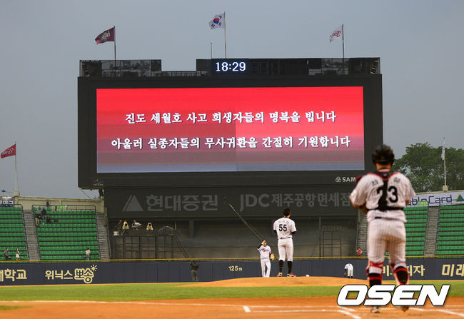 경기에 앞서 진도 세월호 사고의 희생자들의 명복과 실종자들의 무사귀환을 기원하는 메시지가 전광판을 통해 나오고 있다.