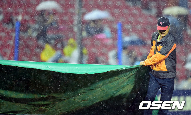 2회초 우천으로 인해 경기가 중단되고 있다.