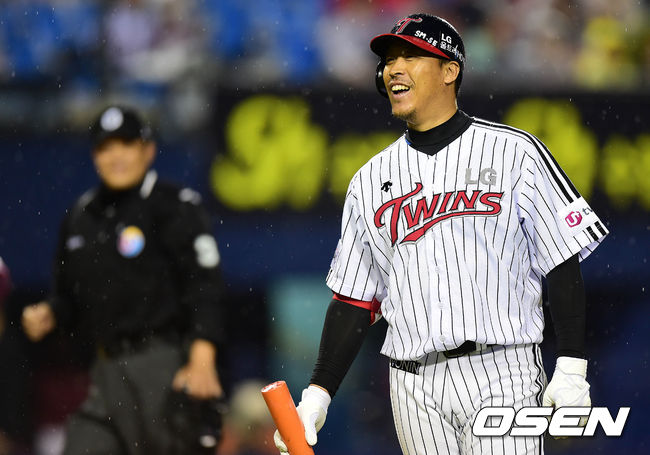 1회말 무사 만루에서 LG 이병규가 넥센 나이트의 투구에 맞았다고 어필했지만 받아들여지지 않자 미소를 짓고 있다.