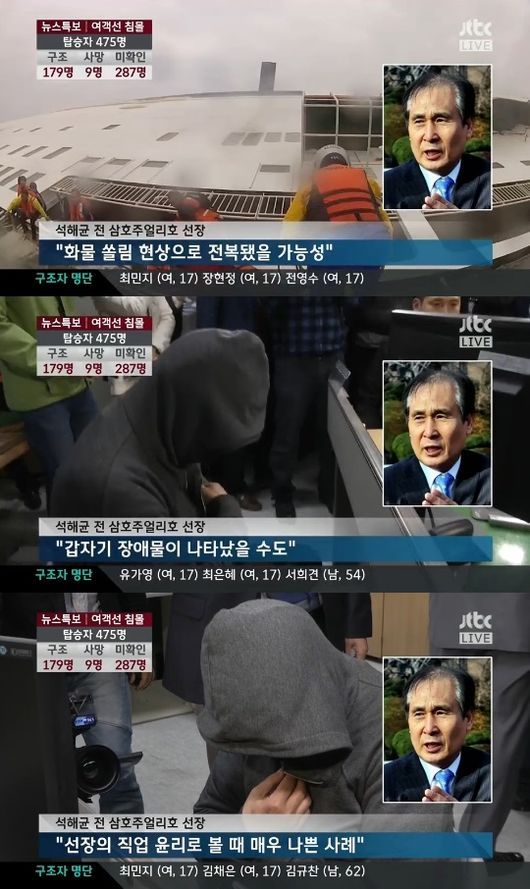 이에 앵커가 “변침에 의한 전복사고가 종종 일어나느냐"고 질문하자, 석 선장은 "잘 일어나지 않는다. 평소에 변침은 저각도로 천천히 한다. 갑자기 앞에 장애물이 나타나니까 급브레이크 밟듯이 한 것 같다"고 단호하게 답했다.