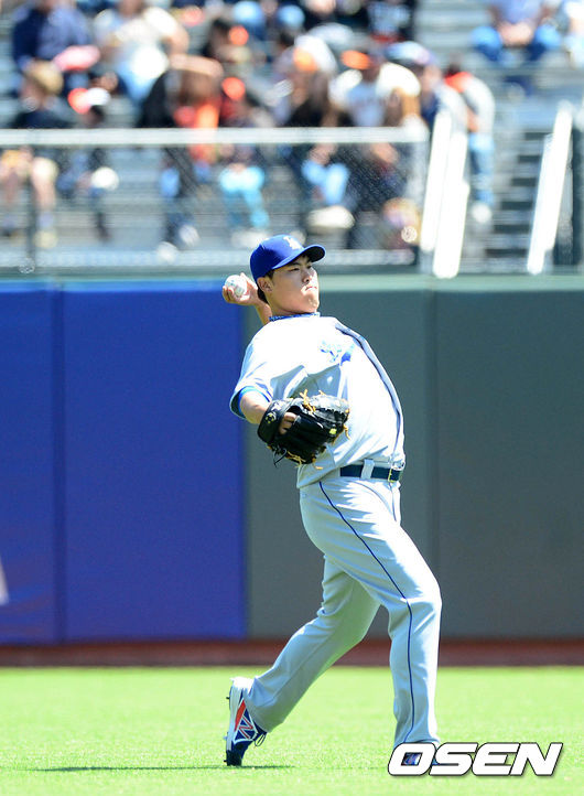 18일(이하 한국시간) 미국 캘리포니아주 샌프란시스코 AT & T 파크에서 열리는 '2014 메이저리그' LA 다저스와 샌프란시스코 자이언츠의 경기를 앞두고, 선발로 나서는 다저스 류현진이 캐치볼로 몸을 풀고 있다.