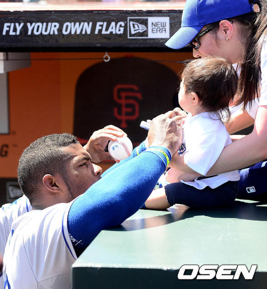 경기에 앞서 다저스 푸이그가 팬들에게 사인을 해주고 있다.