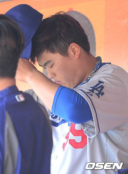 1회말 샌프란시스코 공격을 무실점으로 막아낸 다저스 선발 류현진이 더그아웃에서 모자를 고쳐쓰고 있다.