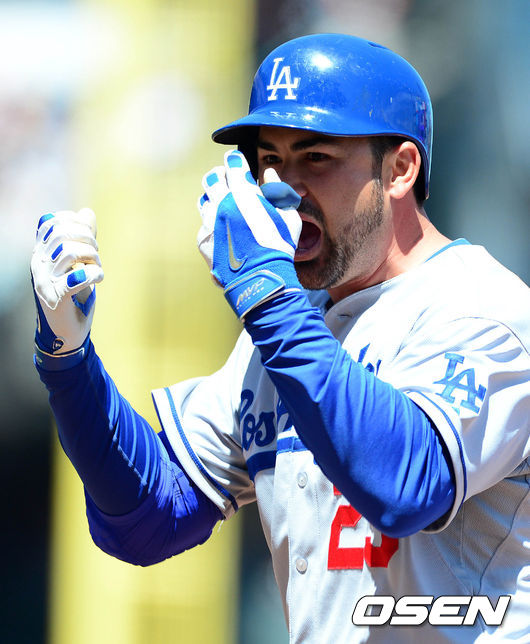 5회초 다저스 공격 1사 3루 상황 1타점 적시 우전안타를 날린 곤잘레스가 환호하고 있다.