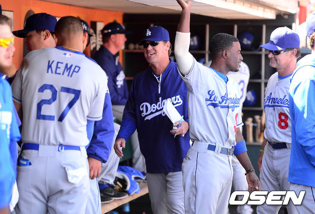 7회말 샌프란시스코 공격까지 무실점으로 호투한 다저스 선발 류현진이 허니컷 투수코치, 매팅리 감독과 인사를 나누고 있다./jpnews@osen.co.kr