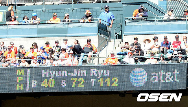 7회말 샌프란시스코 공격까지 무실점으로 호투한 다저스 선발 류현진의 투구수가 전광판에 표시되고 있다./jpnews@osen.co.kr