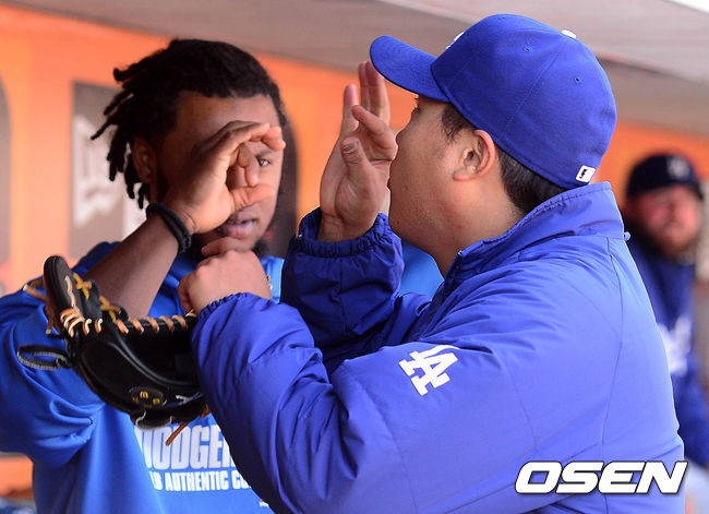 7회말 샌프란시스코 공격까지 무실점으로 호투한 다저스 선발 류현진이 라미레스와 인사를 나누고 있다./jpnews@osen.co.kr