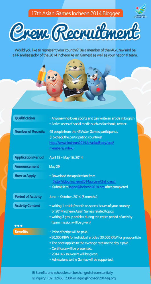 지원 방법은 영문 블로그(blog.incheon2014ag.com/3rd_crew)에서 지원서를 다운로드 후 작성해 이메일(iagoc@incheon2014ag.org)로 제출하면 된다.