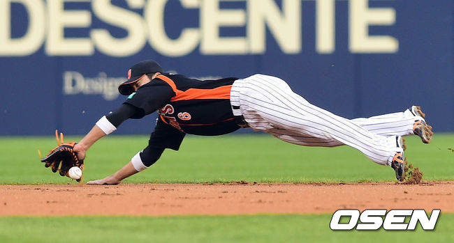 18일 오후 서울 잠실구장에서 열린 '2014 한국야쿠르트 세븐 프로야구' 두산 베어스와 롯데 자이언츠의 경기 1회말 선두타자 민병헌의 내야안타를 유격수 문규현이 놓치고 있다.