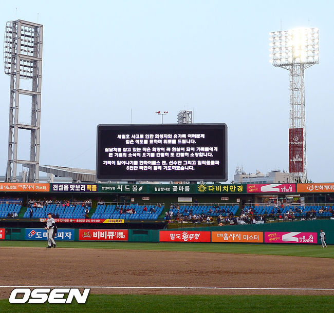 18일 오후 대전구장에서 열린 '2014 한국야쿠르트 세븐 프로야구' 한화 이글스와 LG 트윈스의 경기, 1회초 이닝교체때 세월호 침몰 실종자 및 유가족을 애도하는 문구가 전광판에 표시되고 있다.