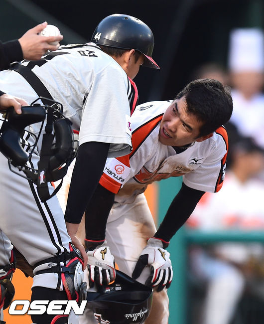 18일 오후 대전구장에서 열린 '2014 한국야쿠르트 세븐 프로야구' 한화 이글스와 LG 트윈스의 경기, 1회말 1사 3루 한화 피에의 내야땅볼때 3루 주자 정근우가 홈에서 태그아웃된 후 아쉬워하고 있다.