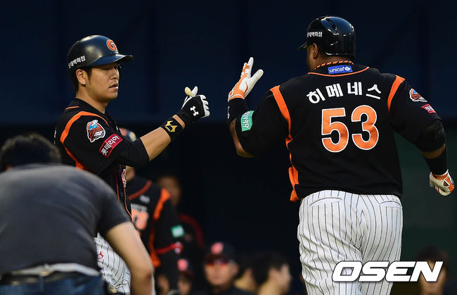18일 오후 서울 잠실구장에서 열린 '2014 한국야쿠르트 세븐 프로야구' 두산 베어스와 롯데 자이언츠의 경기 2회초 선두타자 히메네스가 솔로포를 치고 강민호와 하이파이브를 하고 있다.