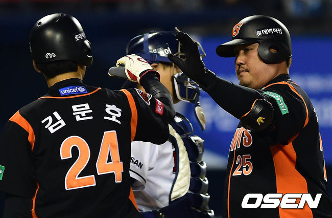 18일 오후 서울 잠실구장에서 열린 '2014 한국야쿠르트 세븐 프로야구' 두산 베어스와 롯데 자이언츠의 경기 2회초 2사 2,3루 최준석이 스리런포를 날리고 김문호와 하이파이브를 하고 있다.