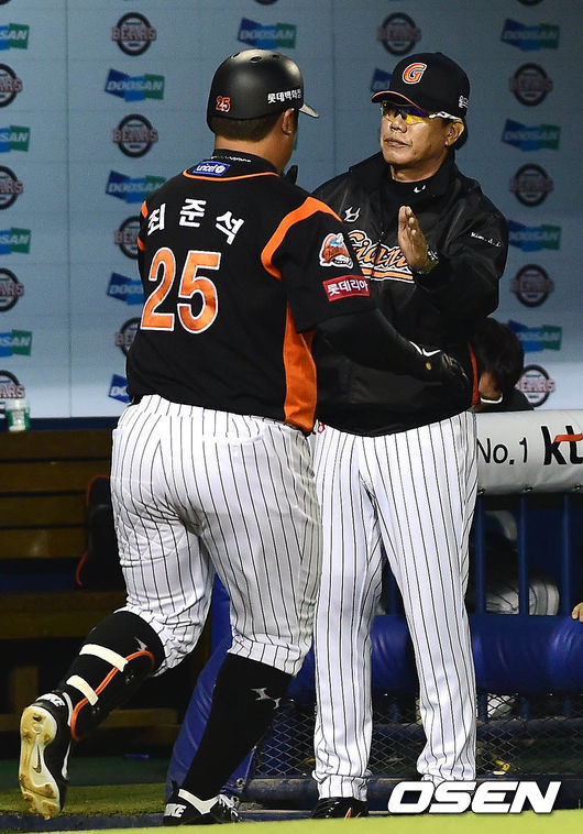 18일 오후 서울 잠실구장에서 열린 '2014 한국야쿠르트 세븐 프로야구' 두산 베어스와 롯데 자이언츠의 경기 2회초 2사 2,3루 최준석이 스리런포를 치고 김시진 감독과 하이파이브를 하고 있다.