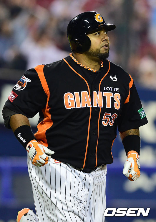 18일 오후 서울 잠실구장에서 열린 '2014 한국야쿠르트 세븐 프로야구' 두산 베어스와 롯데 자이언츠의 경기 4회초 1사 2루 히메네스가 투런포를 치고 날아가는 타구를 바라보고 있다.