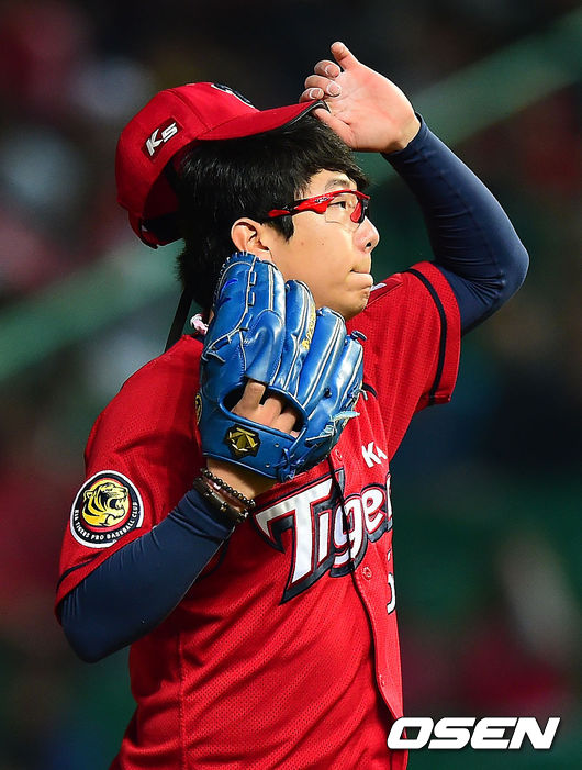6회말 2사 1,2루 KIA 양현종이 자신이 던진 공이 볼 판정을 받자 아쉬워하고 있다.