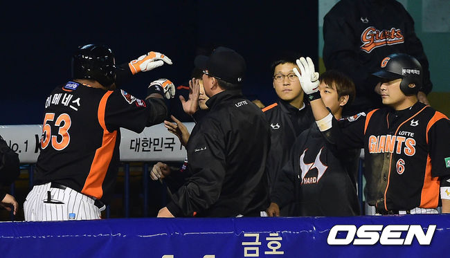 18일 오후 서울 잠실구장에서 열린 '2014 한국야쿠르트 세븐 프로야구' 두산 베어스와 롯데 자이언츠의 경기 4회초 1사 2루 히메네스가 투런포를 치고 덕아웃에서 동료들과 하이파이브를 하고 있다.