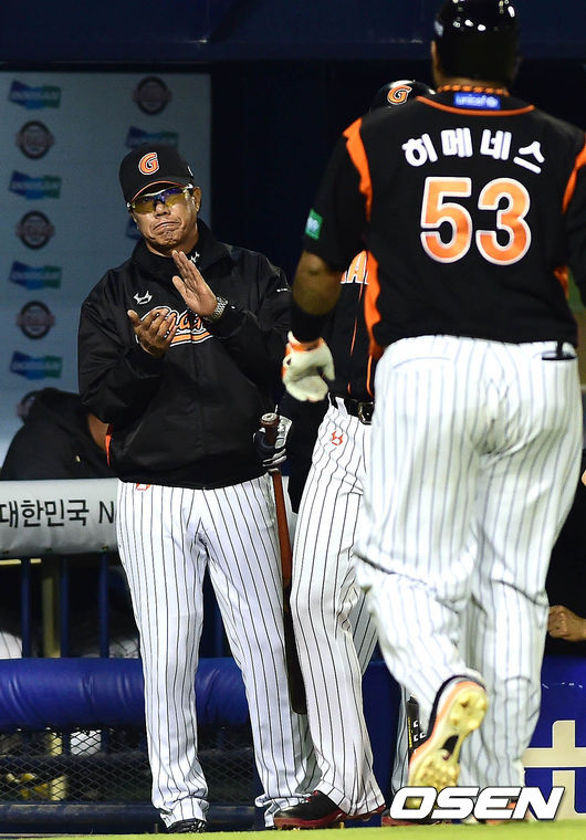 18일 오후 서울 잠실구장에서 열린 '2014 한국야쿠르트 세븐 프로야구' 두산 베어스와 롯데 자이언츠의 경기 4회초 1사 2루 히메네스가 투런포를 치자 김시진 감독이 박수를 치고 있다.