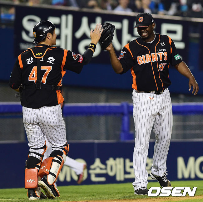 18일 오후 서울 잠실구장에서 열린 '2014 한국야쿠르트 세븐 프로야구' 두산 베어스와 롯데 자이언츠의 경기 4회말 1사 만루 민병헌을 병살로 처리한 유먼이 강민호와 하이파이브를 하며 덕아웃으로 향하고 있다.