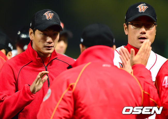 승리를 거둔 SK 김광현과 박정권이 이만수 감독과 하이파이브를 하고 있다./youngrae@osen.co.kr