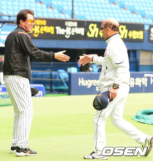 19일 오후 서울 잠실야구장에서 열리는 '2014 한국야쿠르트 세븐 프로야구' 두산 베어스 대 롯데 자이언츠의 경기를 앞두고, 두산 송일수 감독과 롯데 김시진 감독이 인사를 나누고 있다.