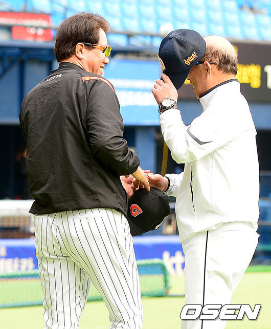 19일 오후 서울 잠실야구장에서 열리는 '2014 한국야쿠르트 세븐 프로야구' 두산 베어스 대 롯데 자이언츠의 경기를 앞두고, 두산 송일수 감독과 롯데 김시진 감독이 인사를 나누고 있다.